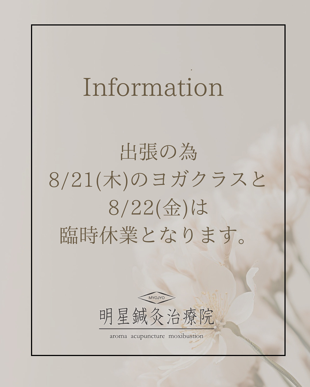 ホーム > 院長ブログ 8月22日(金)は臨時休業となります。 2025/08/04 いつも当院をご利用いただき誠にありがとうございます。 出張のため、 8月21日のヨガクラスと 8月22日の営業は休業させて頂きます。 なお、お問い合わせは承っておりますが、お電話に出ることが難しくなりますので ご予約フォームや公式LINE、インスタグラムのDMから頂けますと幸いです。 ご迷惑おかけいたしますが何卒よろしくお願いいたします。 明星鍼灸治療院 梶田明里 - 院長ブログ